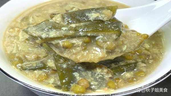 先將洗幹凈的綠豆放入電飯煲中。加多一點的水,煮至開花。海帶提前泡發。切點薑絲,再把海帶和薑絲倒進來。加一點開水,一勺鹽,胡椒粉,攪拌均勻,再煮十分鐘。再把雞蛋液倒進來。用湯的餘溫攪熟,清涼去火。