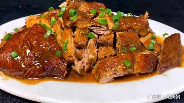 3、然後我們再將鴨肉先撈出來,再把料渣撈幹凈,把鴨肉給放進來,開最小火,把湯汁收幹,一邊在鴨肉上不停的澆。湯汁收幹之後,再將鴨肉切成小塊,鴨肉就做好瞭。