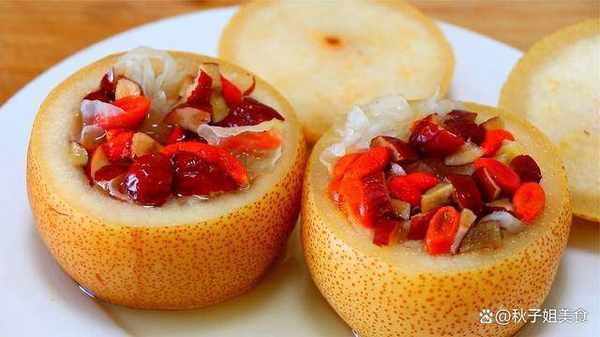 梨搓洗幹凈,銀耳撕成小塊浸泡十分鐘。一把枸杞,幾粒大棗洗幹凈,將大棗剪碎,然後用勺子把梨肉挖出來,然後再放上銀耳,紅棗碎,枸杞,冰糖,加入適量的清水。蓋上梨蓋,再放入蒸鍋裡,水開後蒸20分鐘,冰糖雪梨就做好瞭。