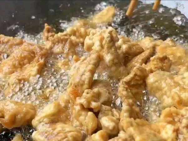 油溫五成熱,放入肉片炸,一片一片的放入,防止粘連在一起,用中火慢慢的炸,翻下去後別急著去翻動它,容易偷漿。炸至定型,用筷子輕輕的晃動一下,要經常地翻動四面砸,防止底部糊瞭。