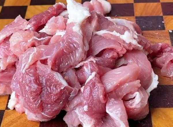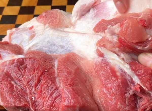 做醋肉要選擇這種梅花肉,做出來的口感會更嫩。用刀把肥的部分切掉,再用刀把它切成薄薄的片,盡量切大片一點,吃起來更過癮。