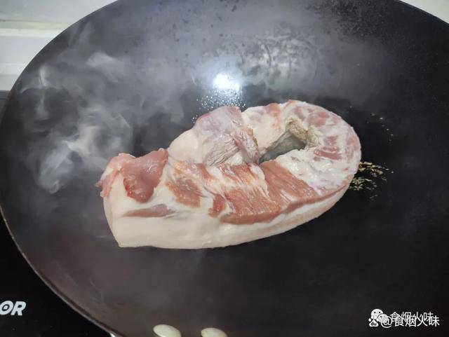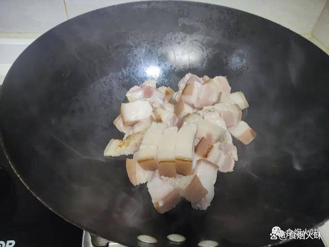 4.鍋裡面水分幹後直接把切好的五花肉下入鍋中,小火炒,慢慢煸炒,等到裡面的油脂煸炒出來。如果說油脂比較多的話,我們就給它取出適量放碗中,平時燒菜用;