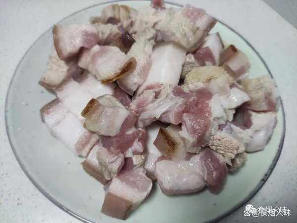 3.整個肉都完全焯到水之後,我們就把它撈出再用清水洗凈,洗凈瀝幹表面水分放在案板上切成小塊,切好的肉放在碗中備用;