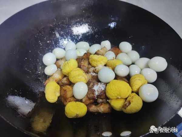 5.往裡面加上兩勺的白糖,用小火炒香。糖炒成糖漿,炒好之後再用鏟子把五花肉跟糖炒均勻,接著我們把備好的鵪鶉蛋還有板栗放入裡面,也是炒均勻;