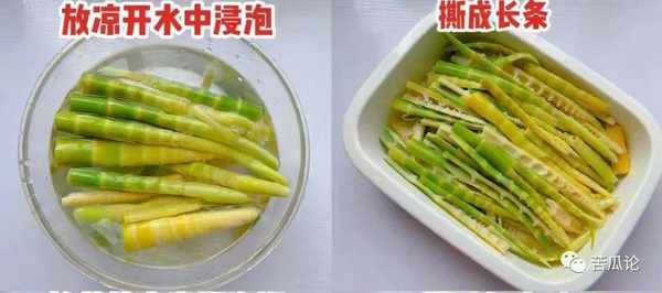 ②煮過的竹筍放在涼水中泡一泡,可以將竹筍泡軟,隨後將竹筍撕開放碗中。
