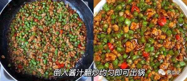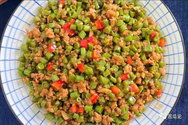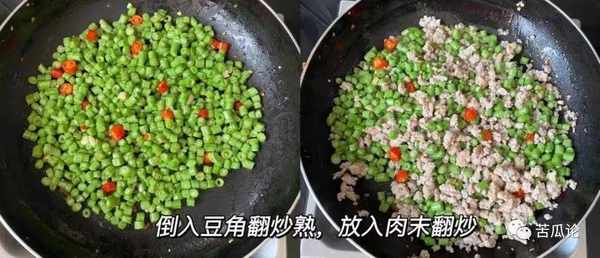 ③接著倒入豆角,豆角炒至半熟,就可以倒入肉末。繼續翻炒均勻。