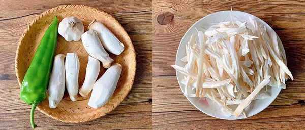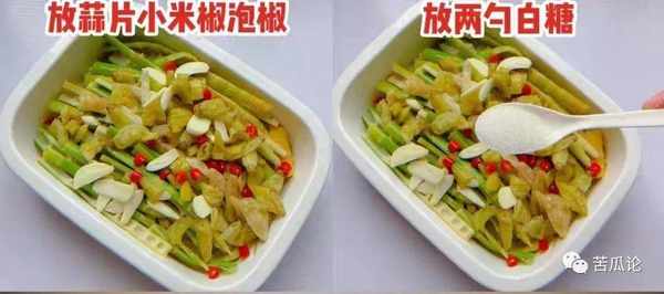 ③繼續在竹筍中放蒜片、小米椒、泡椒等配料,再放點砂糖,可以減少澀味。
