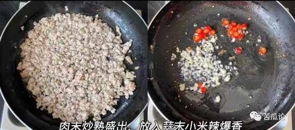 ②接著熱鍋,倒入肉末,放點食鹽炒熟後撈起備用。重新熱鍋放油,蒜末、小米椒炒出香味。