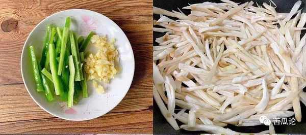 ②青椒同樣切碎,再準備一些蒜末。隨後就熱鍋放油,倒入杏鮑菇,稍微炒扁,放食鹽調味炒勻,隨後撈起備用。