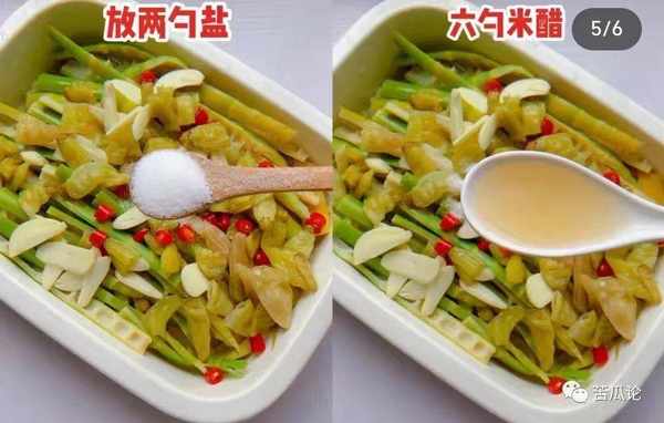 ④繼續放點食鹽,放入一些米醋,米醋要淹沒竹筍,不然醃制不入味,攪拌均勻,醃制2小時就可以吃。
