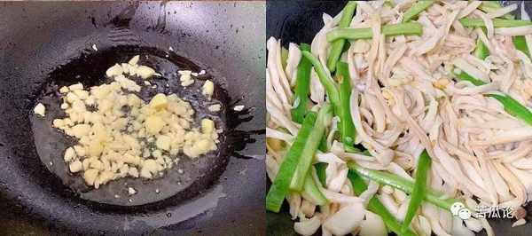 ③繼續熱鍋,爆蒜香,倒入杏鮑菇和青椒,一起炒勻,再放點食鹽調味。