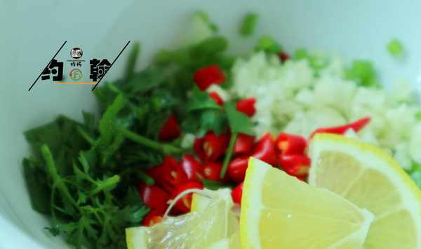 (7):準備一個好看的碗,放入切好的蒜末、小米椒、蔥花、香菜、檸檬片(我沒有好看的碗)。