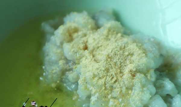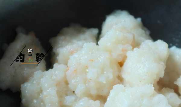 (2):準備一個大碗,放入剁好的蝦泥,加大約1克的食用鹽、1克胡椒粉、雞蛋清1個。