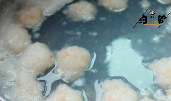(5):鍋中燒水,水開後下入蝦滑球,煮到每個蝦球都浮起來就可以撈出來瞭。