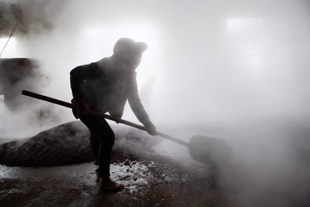 ——冷散:將蒸好的面楂用木鍬鏟出甑鍋放倒幹凈的地面上用木鍬攤薄、勻,進行自然冷散,中途翻拌數次冷散,視溫度達到夏季為20—22℃為宜,冬天為16—18℃為宜。