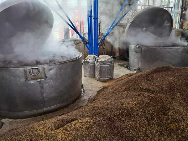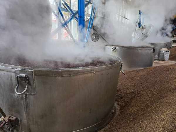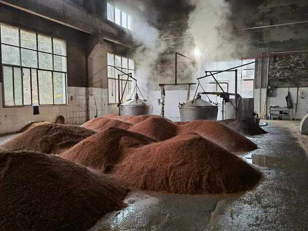 ——蒸煮糊化:將面楂上甑鍋進行蒸煮糊化,蒸煮糊化前將面楂再翻拌一次,然後用木鍬和菠萁將面楂一層一層地裝入甑鍋,待汽圓後蒸煮糊化1小時左右,使面熟而不粘,內無生心,由有經驗的釀酒師用手捻來感覺蒸煮程度。