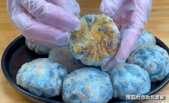 水分完全收幹後,夾出來擺入盤中,一盤非常好吃的紅薯葉生煎包就做好啦。外皮椒香酥脆,裡面的餡料鮮香味美。