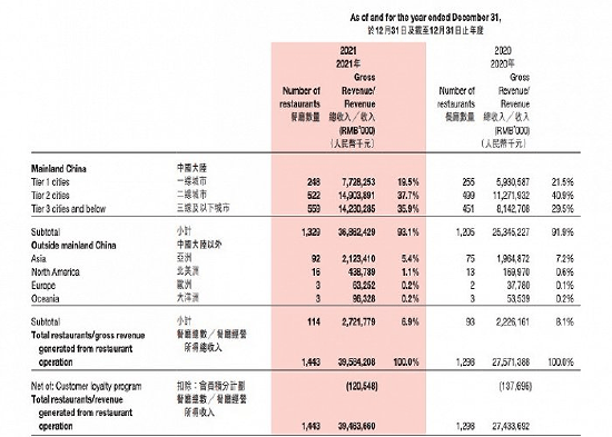 截至2021年12月31日,海底撈在全球開設1443傢直營餐廳,其中1329傢門店位於中國內地,114傢門店位於中國香港、中國澳門、中國臺灣及其他海外市場。