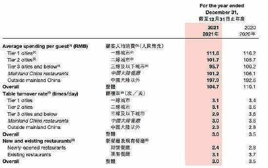 但同時,海外門店的翻臺率卻更低。對比2021年中國內地餐廳整體3.0次/天的翻臺率,中國內地以外餐廳的整體翻臺率僅為2.3次/天。