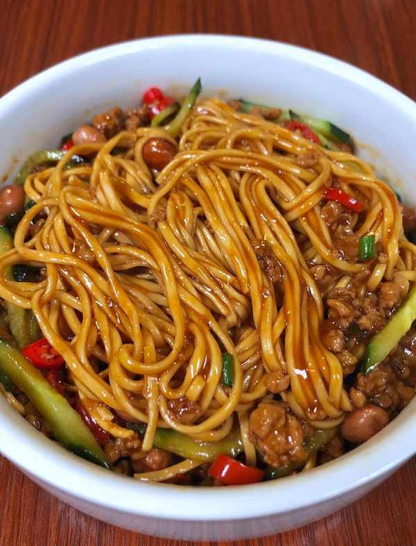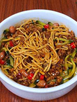 第二步:另起鍋水開下面條煮熟撈出,澆上肉醬,熟花生,黃瓜絲,撒點蔥花拌勻即可