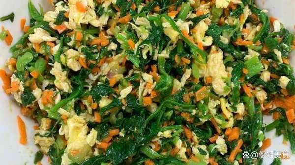 2、菠菜素餡當然少不瞭雞蛋和胡蘿卜,它們才是絕配,鮮香又營養。鍋中放入適量雞蛋,把它炒成雞蛋碎放入菠菜內,去皮以後的胡蘿卜切成細絲後再改刀剁碎,不需要焯水,直接放入菜餡內,放入2勺蠔油、小半勺味極鮮、小半勺雞精、多半勺香油、少許鹽用勺子攪拌一下,這樣調出來的菜餡才更鮮美。