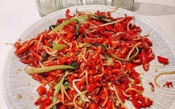 吃瞭3口,直接吃不下去瞭,辣的眼淚直流,喝完水還喝瞭2盒酸奶,才勉強好一點,整道菜除瞭幹辣椒就是小米辣,還有各種燈籠椒,吃完一次,保準不敢吃第二次。