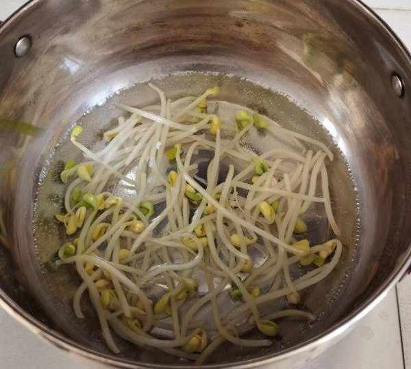 第3步、豆芽焯水一分鐘撈出過冷水瀝幹水分備用。