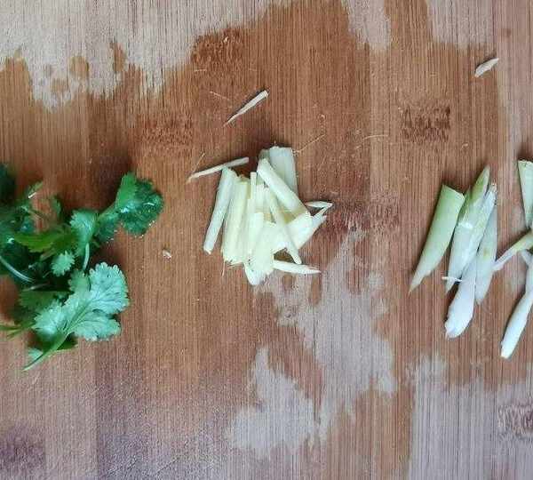 第5步、生薑和小蔥切成絲,香菜切成小段。