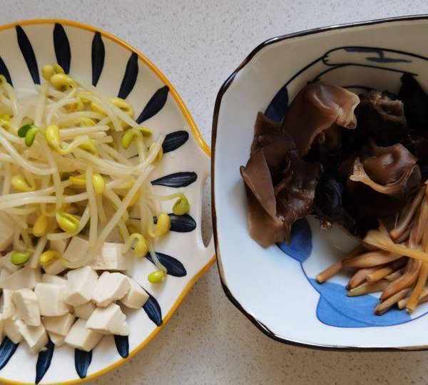 第1步、準備食材,黃花菜和木耳用清水浸泡,豆芽洗凈,豆腐洗凈切成小塊。