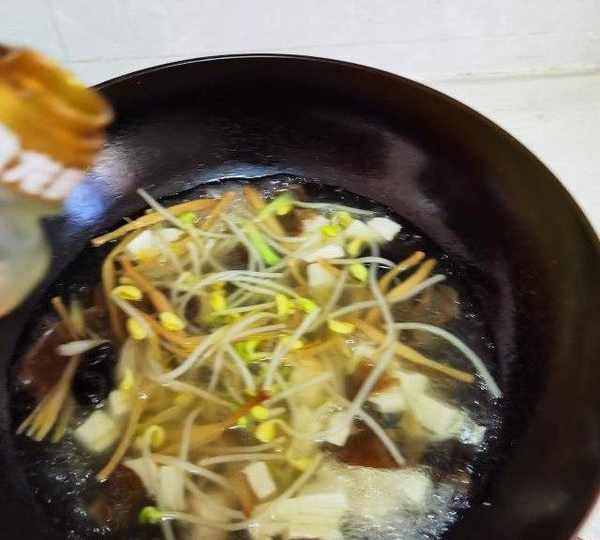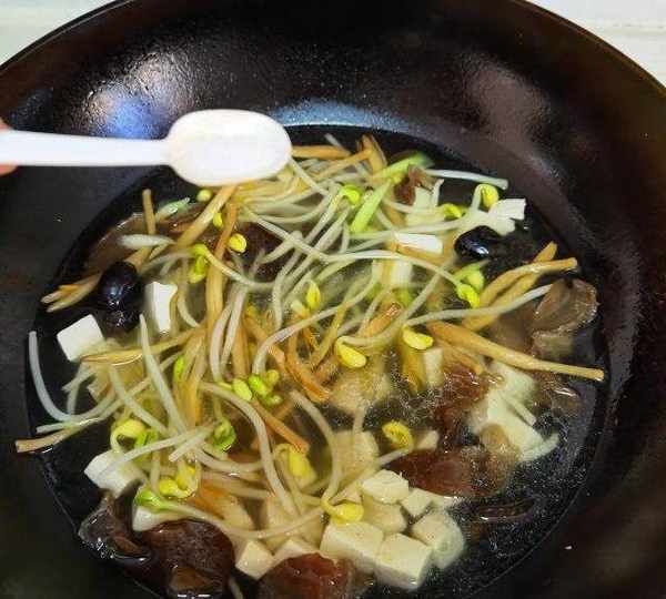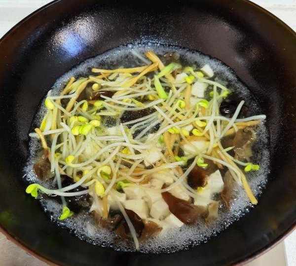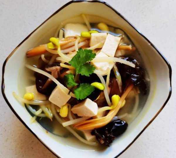 原料:黃豆芽、嫩豆腐、黃花菜、木耳、小蔥、生薑、香菜、鹽、胡椒粉、香油、花生油、清水。
