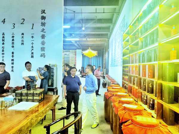 陳磊一行參觀瞭酒莊的產業園、老酒庫、品鑒室等場所,詳細瞭解瞭酒莊的發展歷程、產品定位、生產工藝、市場銷售等情況。參觀產業園時,陳磊對漢禦坊公司的實力表示認可,認為這是釀制好酒的物質基礎;在老酒庫,陳磊對酒莊所儲存的各種年份佳釀表示驚嘆,認為這是酒莊的寶貴財富和品質展現;在品鑒室,陳磊品嘗瞭酒莊的主打產品國潮鶴、國潮鯤鵬和年份老酒,並給予瞭高度評價,認為這是一款酒體幹凈、醬香濃鬱、性價比超高的優質醬酒。