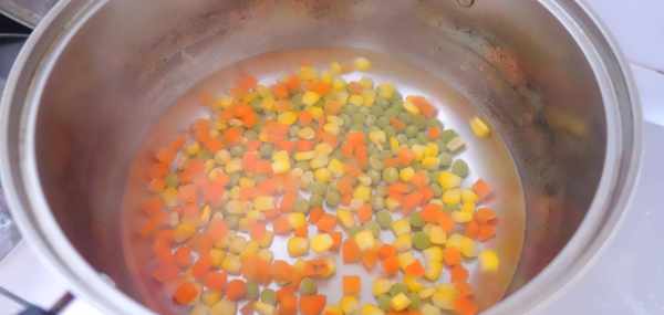 首先將雜蔬放入鍋裡,倒上水覆蓋後煮沸。