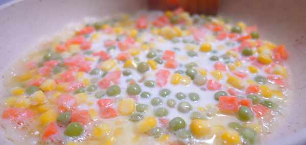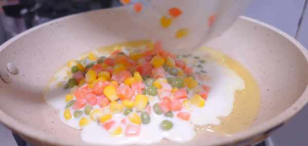 平底鍋倒油,將雜蔬混合液倒入鍋中煎煮。