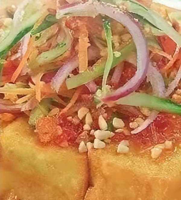把炸好的豆腐排在碟上,黃瓜絲,蘿卜絲,洋蔥絲,辣椒絲鋪滿在豆腐上