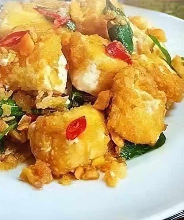 最後加入炸過蛋豆腐續炒,起鍋後撒上蔥花即可