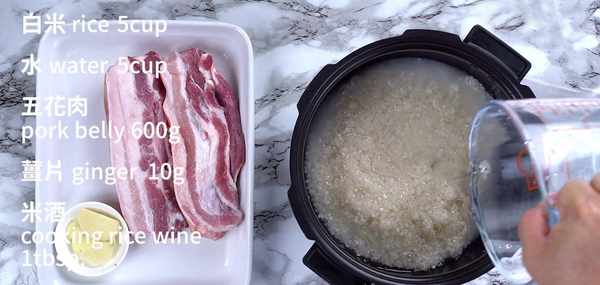 材料:白米 5杯,水 5杯,五花肉 600克,薑片 10克,米酒 1大匙