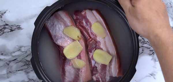步驟2:將五花肉放在米飯最上面,然後放上幾片薑片。