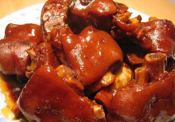 紅燒豬蹄:將豬蹄刮毛洗凈,剁去爪尖劈成兩半,用水煮透後放入涼水中。薑、蔥拍破待用。用炒勺將少許香油燒熱,放入冰糖炸成紫色時,放湯調至淺紅色為度。加入豬蹄、料酒、蔥、薑、鹽、花椒,湯燒開後除去浮沫,用大火燒至豬蹄上色後,移至小火燉爛,收濃汁即成。軟爛的豬蹄簡直是太美味瞭,你也來試一下吧!