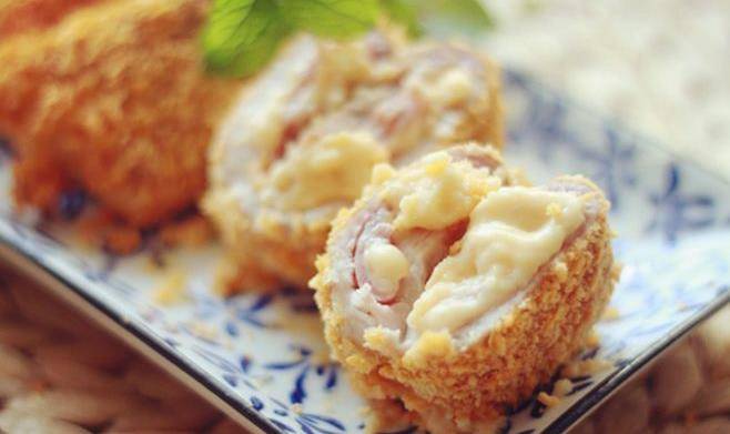 培根芝士肉卷:豬裡脊切薄片,依次擺上半片培根、半片芝士片;卷起來;裹上雞蛋液;沾滿面包糠;放入空氣炸鍋,設置溫度150度,25分鐘,美味又營養的培根芝士肉卷就完成瞭,趕緊來嘗嘗!
