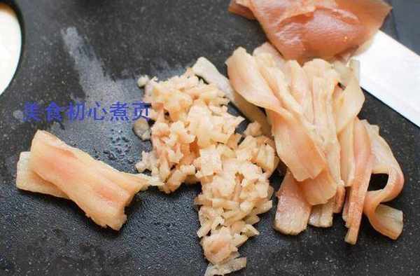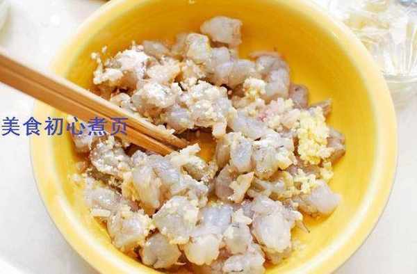 4.在冰箱中放置30分鐘後,將蝦排幹並在冷流水下沖洗,然後用紙巾拍幹。將蝦切成4至5塊,放在碗裡。加入剁碎的肥臀,薑末,蒜末,紹興酒,鹽,糖,白胡椒粉,油和玉米淀粉。拌勻,放在冰箱裡。