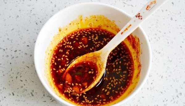 3.碗中倒入辣椒粉、花椒面、白芝麻、蔥花和蒜末,淋上熱油,攪拌均勻,再加入生抽、陳醋、白糖和鹽,攪拌均勻,備用;