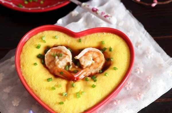 8、蒸到蛋液稍微凝固時加上兩隻保留蝦尾的蝦仁,繼續蒸熟為止。表面放入蝦仁主要是為瞭美觀,嫌麻飯的省略此步。