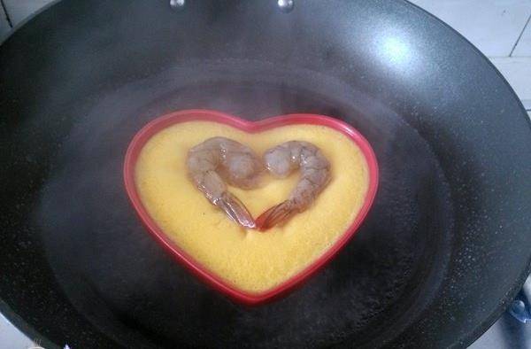 7、過濾好的蛋液加入蝦仁,表面蓋上蓋子,鍋裡水燒開後放入。