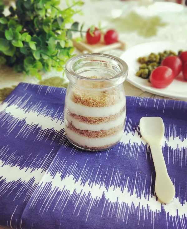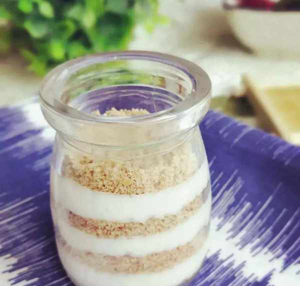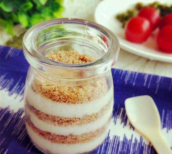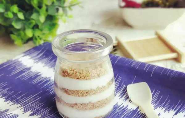 6. 同樣,玻璃瓶擦凈,一層餅幹、一層山藥奶昔地鋪起來就好瞭!