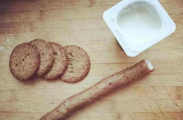 1. 備好消化餅幹或寶寶餅幹、山藥、酸奶。山藥是蒸熟的。下圖的山藥我隻用瞭一半。