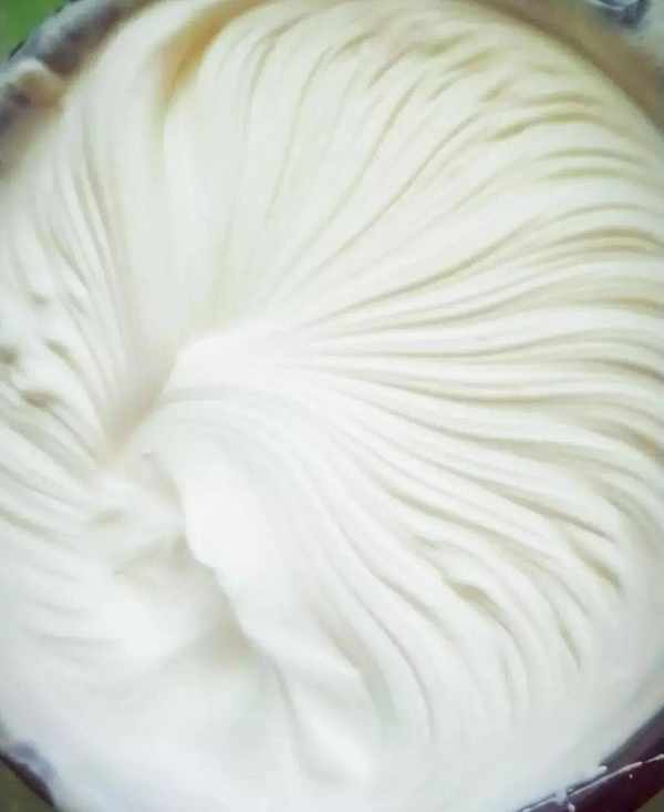 1. 淡奶油加適量糖,放入一個無油無水的容器裡,用打蛋器打發到濃稠、勉強能流動的狀態或有清晰紋路、半固體狀態。看個人喜好。