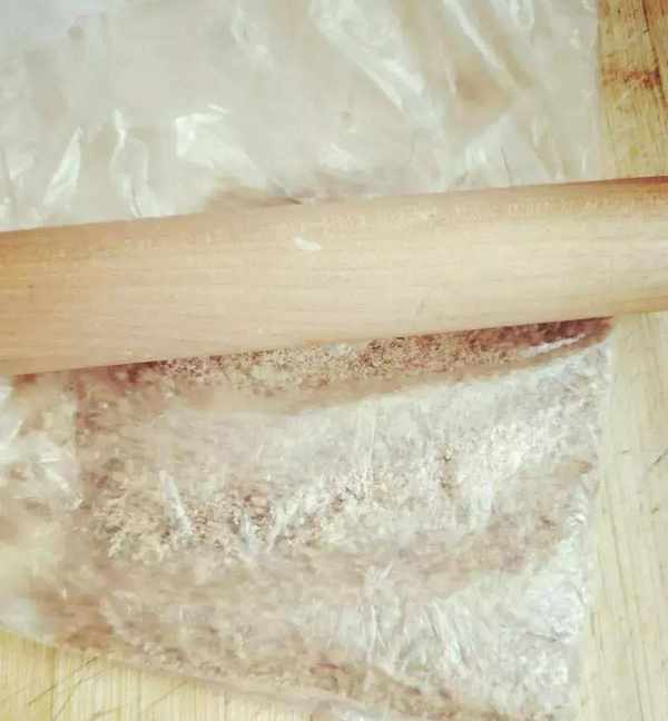5. 消化餅幹放在保鮮袋裡,用搟面杖敲碎,再搟成細碎的渣。給寶寶用普通的餅幹也可以。