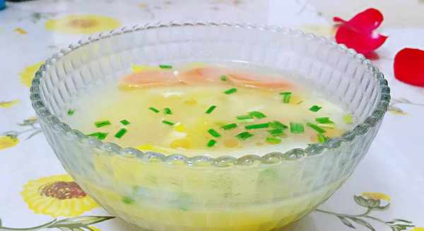 5、水燒開後調入適量的食鹽、雞精,然後淋入打好的蛋液,即可關火;關火後撒上切好的大蒜葉,淋上少許麻油,這樣一碗即簡單又美味的湯就做好啦~