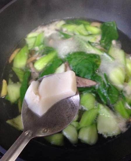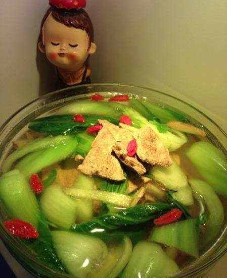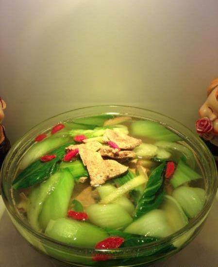 青菜梗軟後放入豬肝和青菜葉,煮開兩到三分鐘,太久豬肝不嫩哦