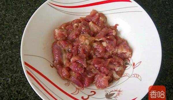 3.瘦肉切絲,用鹽、生抽、白糖、油、生粉調味拌好待用。